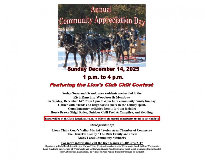 Seeley-Swan and Ovando area residents are invited to the Rich Ranch in Woodworth Meadows on Sunday, December 14th, from 1 pm to 4 pm for a community family fun day!